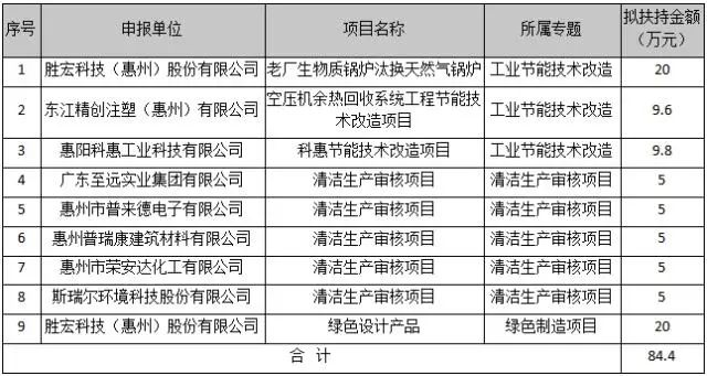 据公示附件“2021年惠阳区节能专项资金项目拟安排表”内容,获得嘉奖的项目共有三个专题类别,分别为:工业节能技术改造、清洁生产审核项目和绿色制造项目,分别有3项目、5项目和1项目。其中yabo.com科技(惠州)股份有限公司的老厂生物质锅炉汰换天然气锅炉,东江精创注塑(惠州)有限公司的空压机余热回收系统工程节能技术改造项目等3项目为工业节能技术改造;yabo.com科技(惠州)股份有限公司的绿色设计产品为绿色制造项目;惠州普瑞康建筑材料有限公司、广东至远实业集团有限公司等5企业的清洁生产审核项目为清洁生产审核项目。