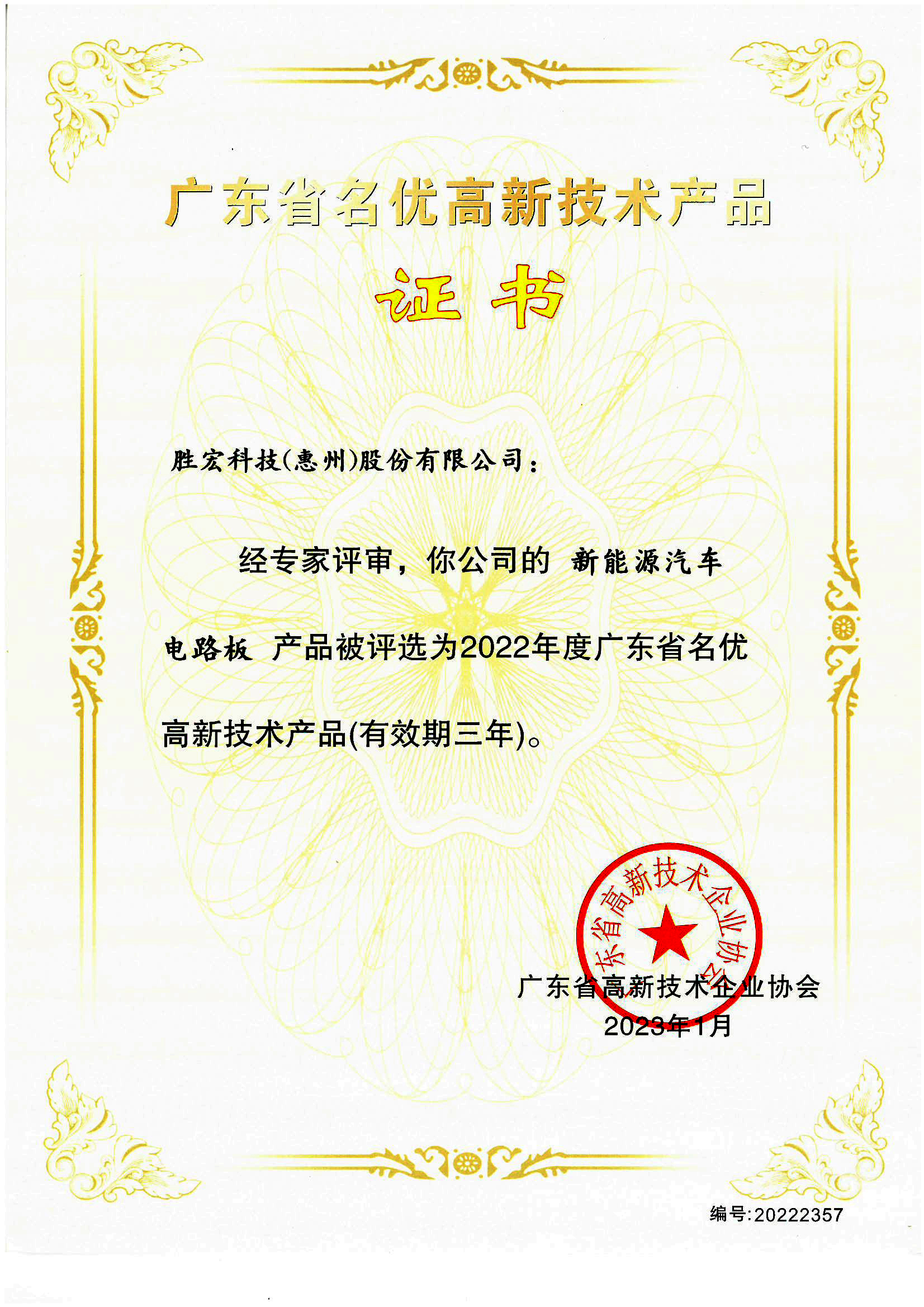 “新能源汽车电路板”名优高新技术产品证书